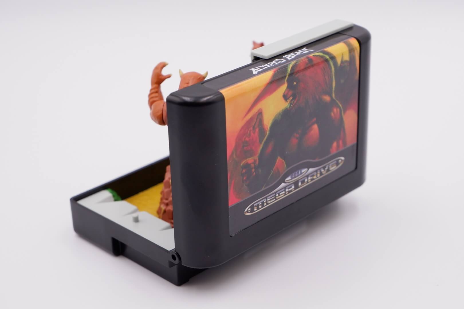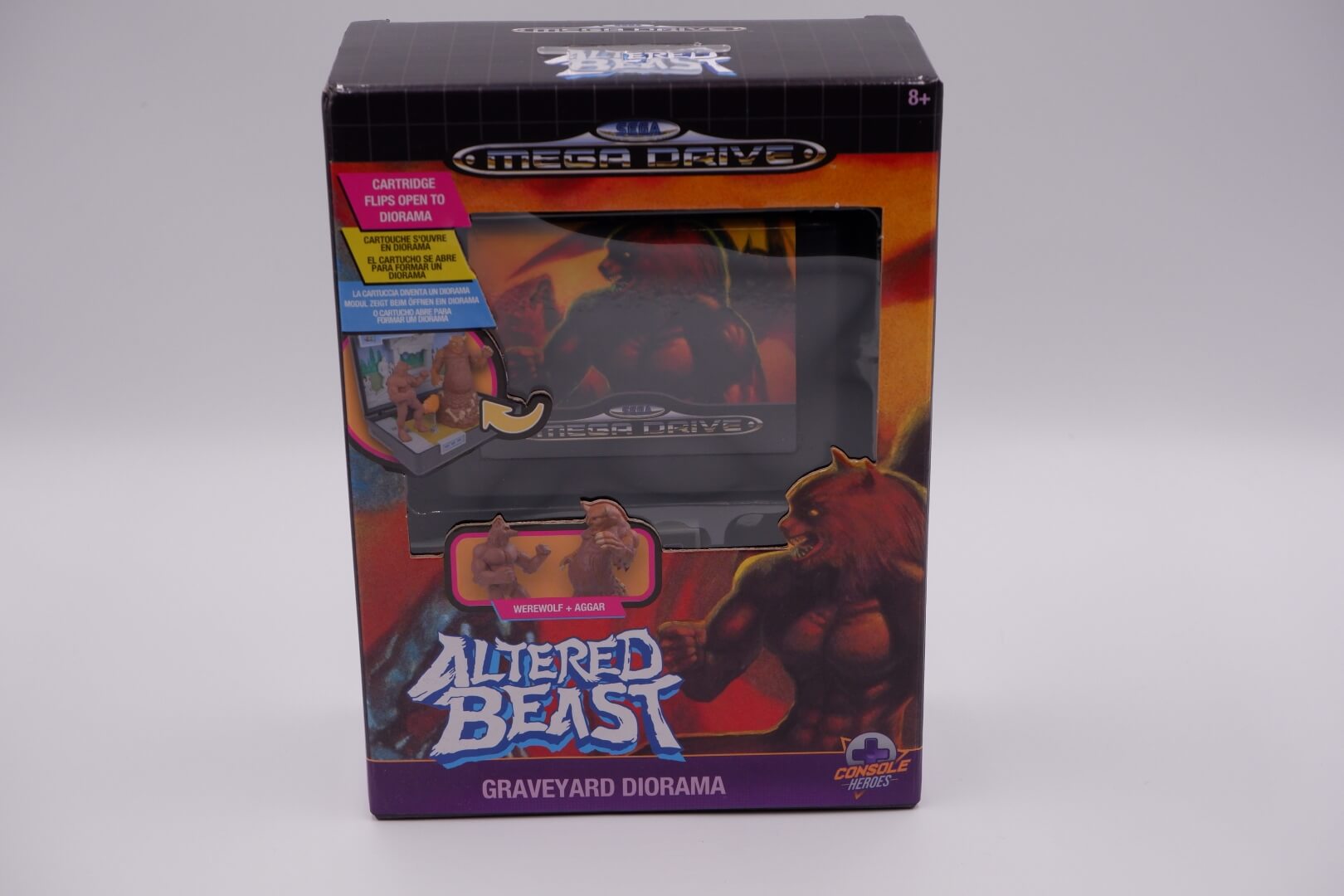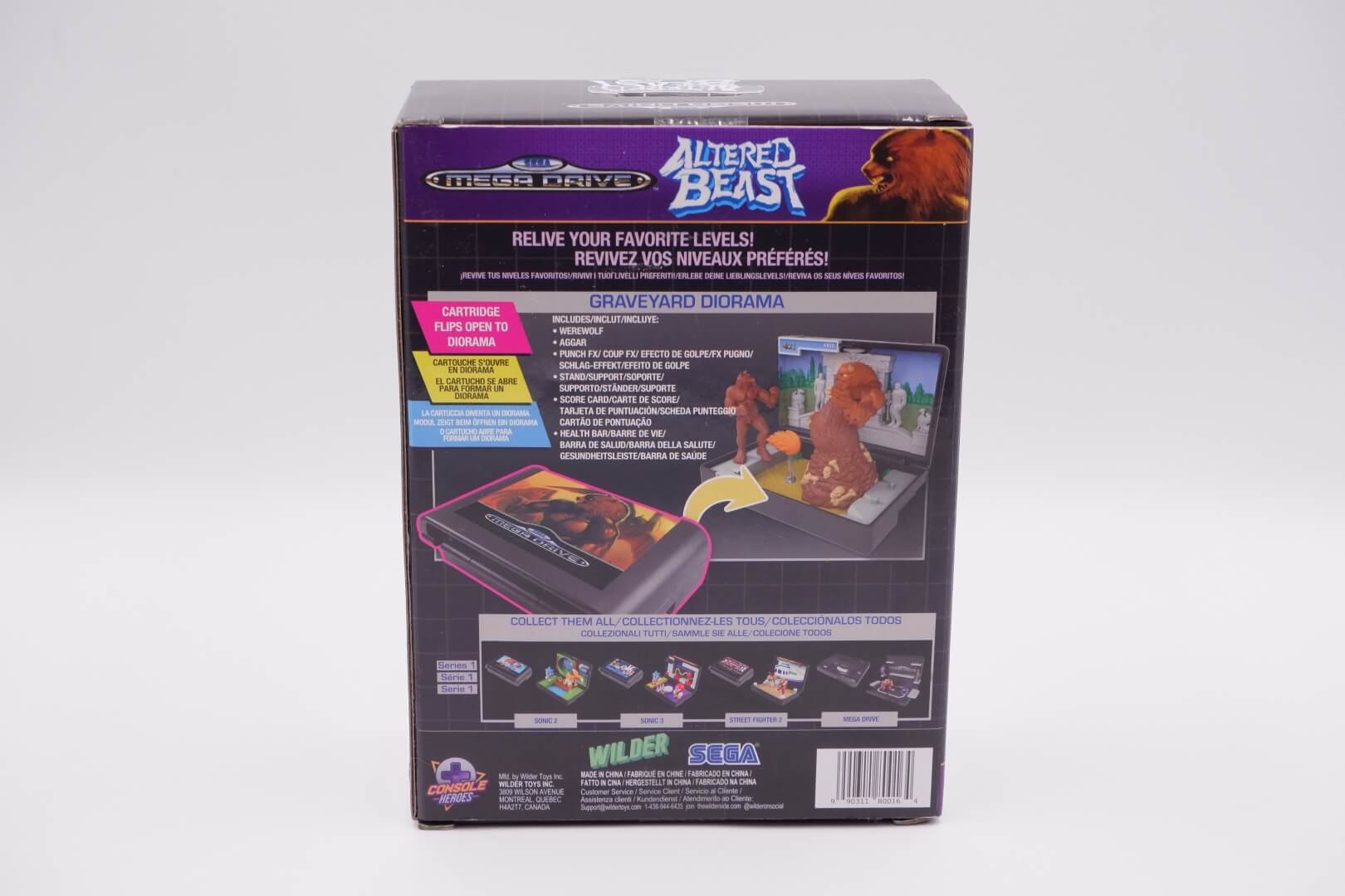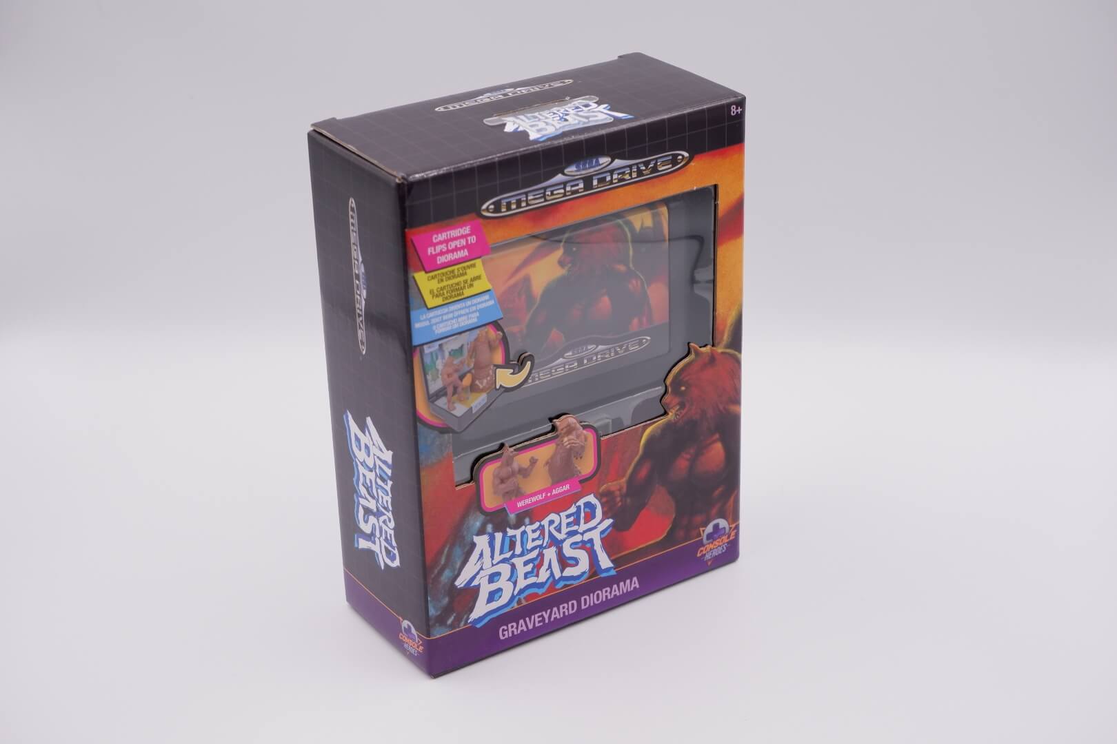 The Wilder Console Heroes: Altered Beast Graveyard Diorama is a nostalgic, officially licensed collectible that reimagines the classic SEGA Genesis experience as a 3D miniature playset. Housed in a plastic shell that replicates the look and size of an original 16-bit game cartridge – complete with authentic-style cover art – the unit flips open to reveal a detailed graveyard scene inspired by the game’s first stage. The set includes two mini-figures: the iconic Werewolf protagonist and the towering, flesh-hurling boss Aggar, both of which can be secured onto the stage via peggable bases. Designed with a retro aesthetic reminiscent of 90s “pocket” playsets like Mighty Max, the diorama features a printed backdrop with the game’s HUD, sculpted bone and statue detailing, and a translucent flame blast effect, making it a compact yet dynamic display piece for retro gaming enthusiasts.