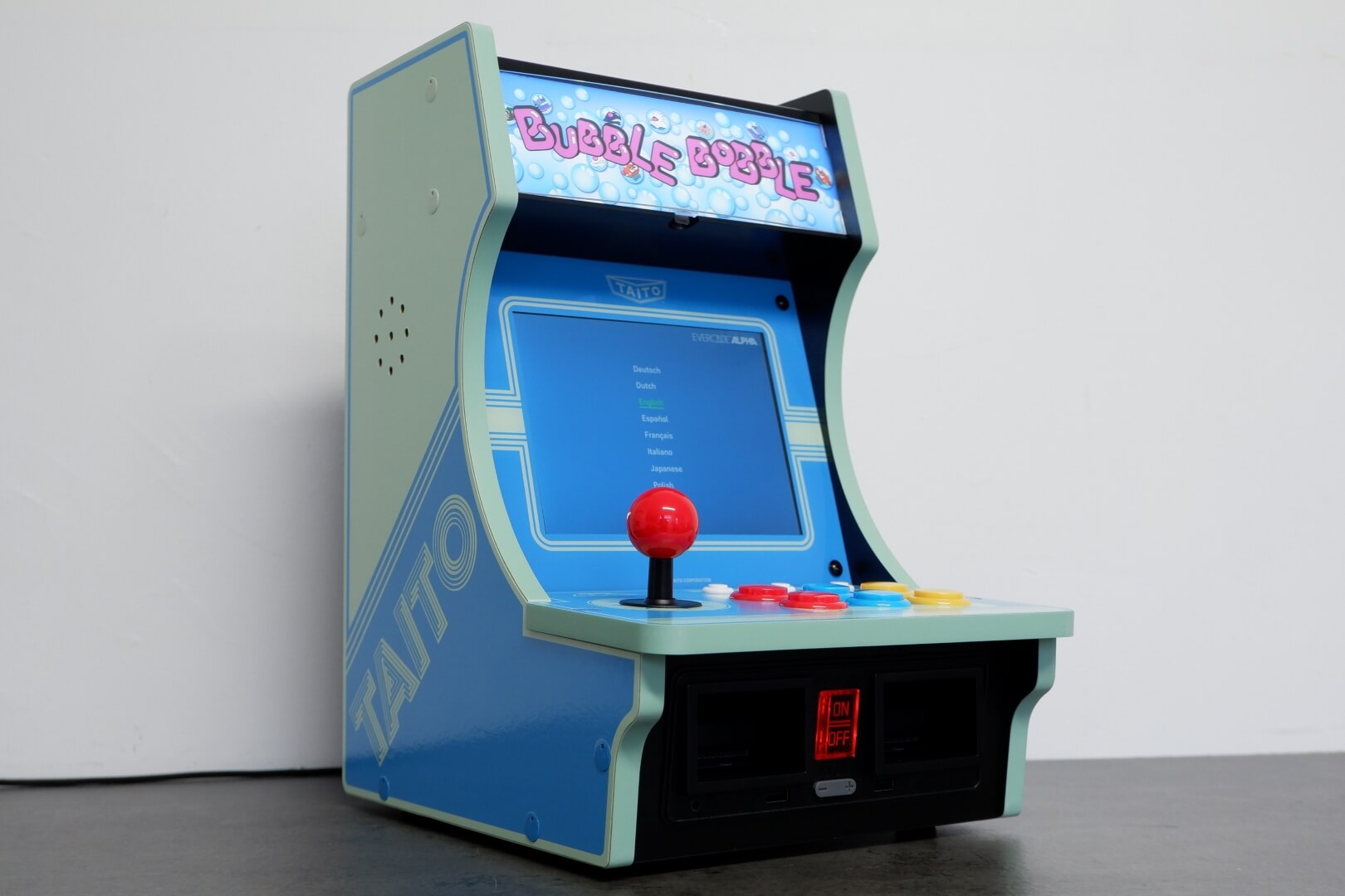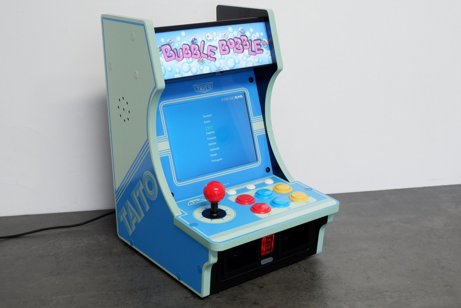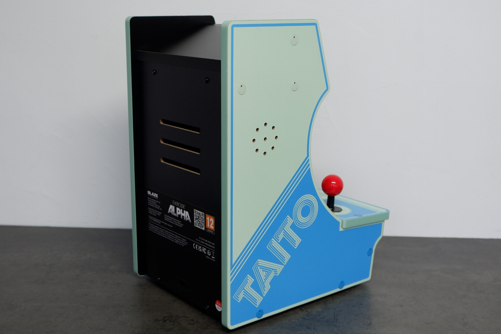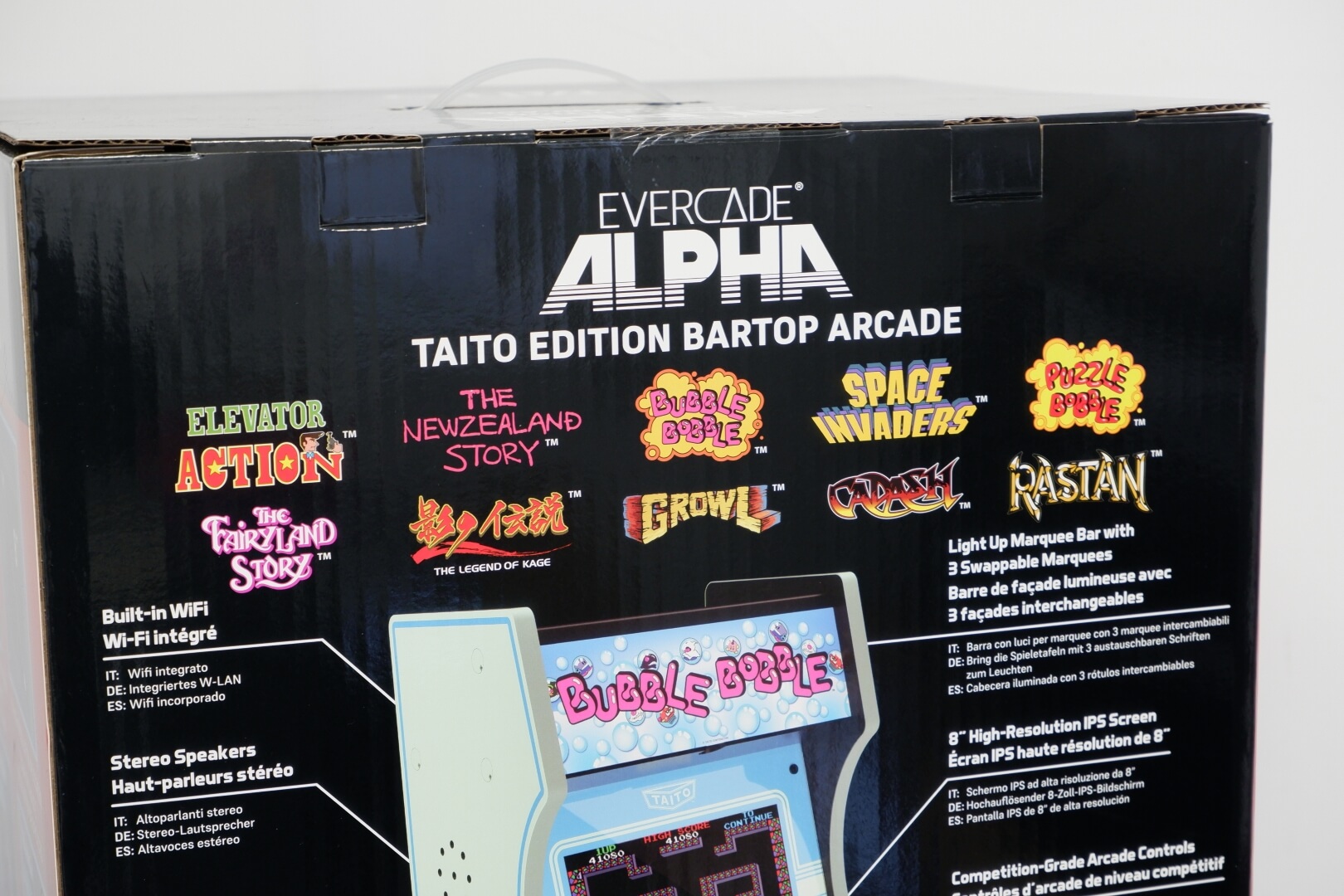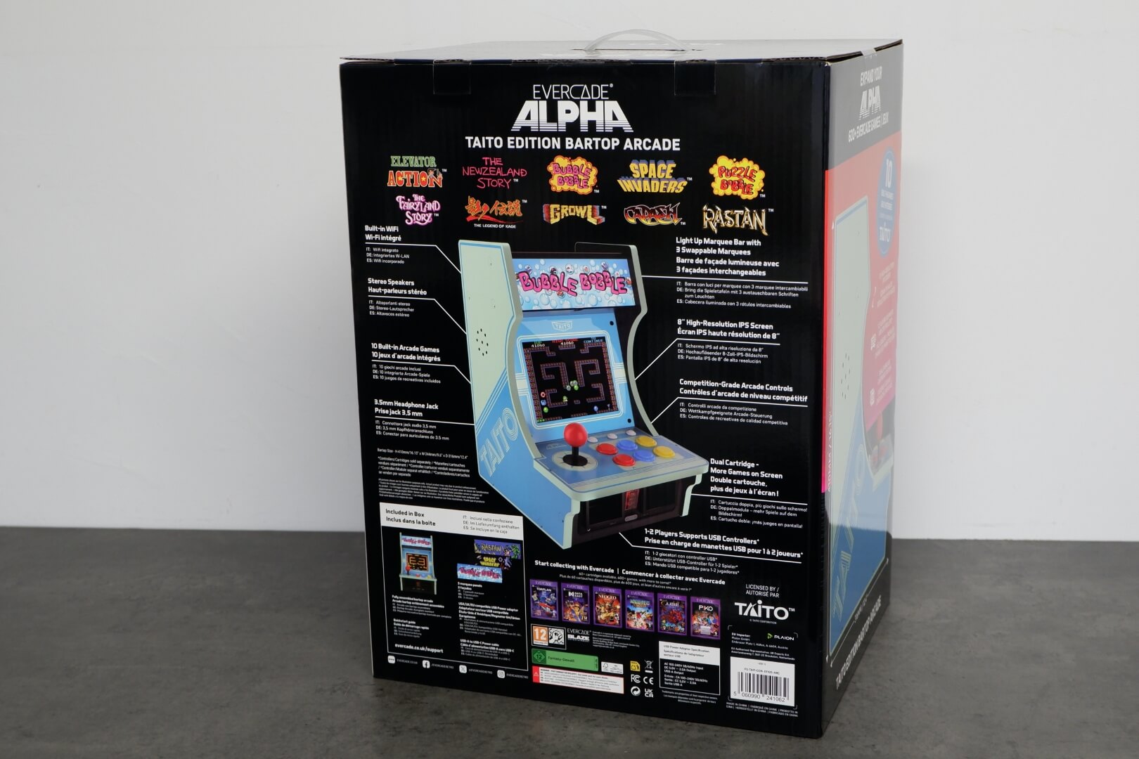 The Evercade Alpha – Taito Edition is a premium bartop arcade cabinet designed to bring an authentic, officially licensed coin-op experience to a desktop or counter. It features a vibrant 8-inch high-resolution IPS display with a 4:3 aspect ratio, paired with “competition-grade” arcade controls. The cabinet is aesthetically modelled after classic Taito machines, sporting a sleek blue and white colour scheme. A standout design feature is the light-up marquee, which comes with three swappable panels featuring artwork for Bubble Bobble, Space Invaders, and Rastan. Unique to the Evercade ecosystem, the Alpha includes dual cartridge slots, allowing users to expand the library beyond its built-in titles by playing any of the 500+ games available in the Evercade physical cartridge library.